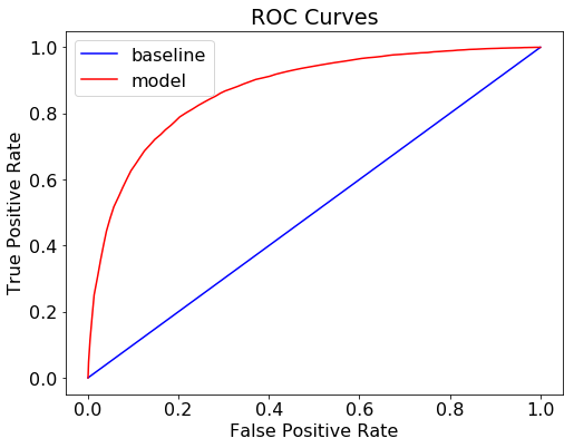 evaluate_mdoel(rf_predictions, rf_probs, train_rf_predictions, train_rf_probs)
