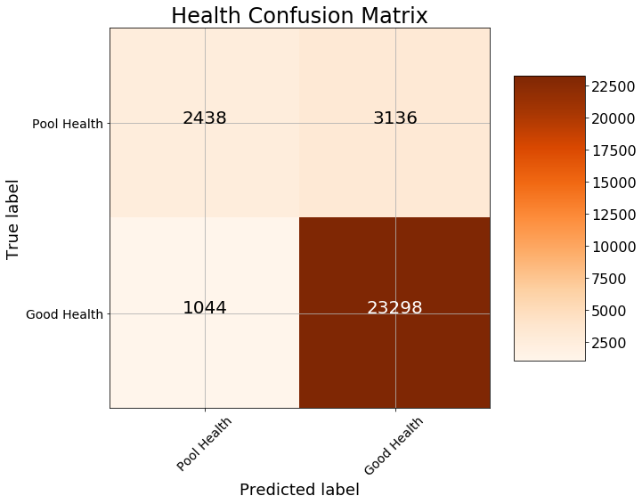 plot_confusion_matrix(cm,classes=['Pool Health','Good Health'],title='Health Confusion Matrix')